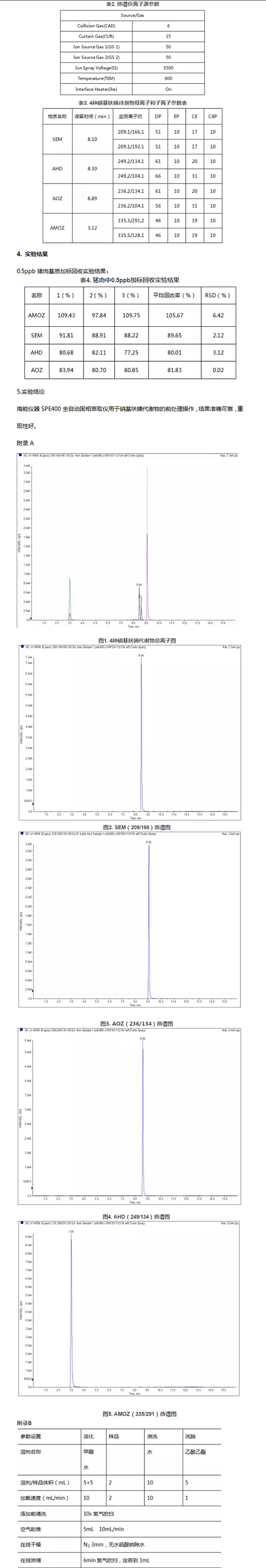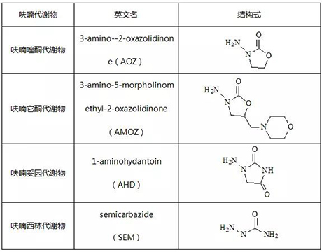 参照中华人民共和国国家标准《猪肉、牛肉、鸡肉、猪肝和水产品中硝基呋喃类代谢物残留量的测定(GB/T 20752-2006)》提供的方法,检测猪肉中的4种硝基呋喃类代谢物残留。