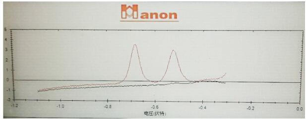 图1 水样中重金属铅镉的测试结果(黑色线为水样,红色线为加标)