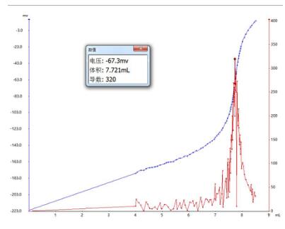 由于样品成分复杂,峰形毛刺较多,建议偏高设置电位突跃量,最后用“参数设置”和“数据平滑”的方式寻找终点。