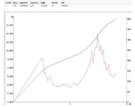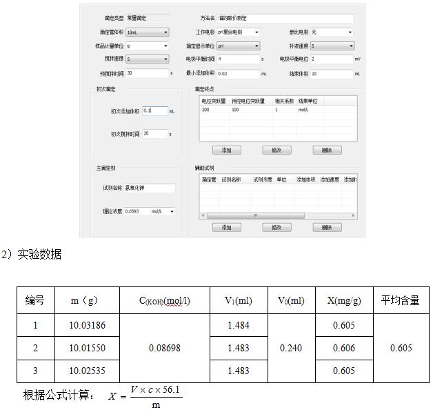 测定方法:准确称取10g左右的油脂,置于滴定杯中,加入异丙醇-乙醚混合溶液60ml溶解,搅拌均匀,用氢氧化钾标准滴定液(0.1mol/l),以pH非水电极为工作电极,在T960上进行滴定至终点。