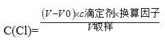 ,其中V是消耗滴定液体积,V0是空白体积,c滴定剂是滴定剂浓度,为0.002mol/L,不同的换算因子,可以将氯离子的含量表示成不同的单位,如表示成ppm,即换算因子为35453,如果表示成mmol/L,则换算因子为1000。