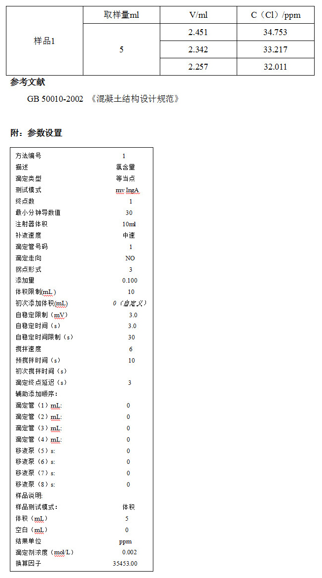 混凝土中氯离子对混凝土中钢筋的锈蚀,是其主要的危害,国家标准GB 50010-2002 《混凝土结构设计规范》中就规定了最大氯含量,因此检测其中的氯含量有很重要的意义。实验采用电位滴定的方法检测混凝土中的微量氯离子,得到较满意的效果。