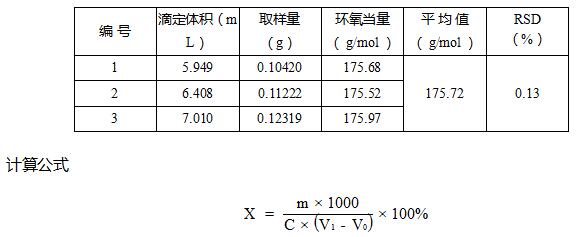 测试结果RSD值为0.13%,测定的环氧当量重复性良好。