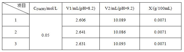 试剂空白试验:取水80 mL,先用0.04514mol/L氢氧化钠标准溶液滴定至PH=8.2(记录用去氢氧化钠标准溶液的体积,此为测总酸的试剂空白试验)。再加入20ml甲醛溶液,继续用0.04514mol/L氢氧化钠标准溶液滴定至酸度计指示PH=9.2。第二次所用氢氧化钠标准溶液的体积为测定氨基酸态氮的试剂空白试验。