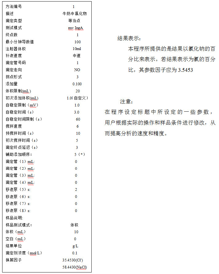 牛奶中氯化物的测定(即氯化钠含量),是使用标准浓度的硝酸银溶液来进行滴定的,通过以下反应,将氯化物按照化学计量学定量沉淀为氯化银。