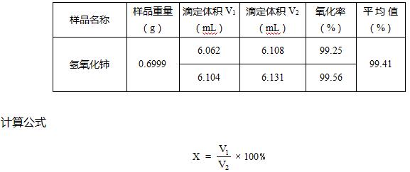 铈产品是产量最大的稀土产品,三价铈产品以碳酸铈为主,四价铈产品则以氢氧化铈为主。氢氧化铈主要用于荧光屏添加剂、制备汽车尾气净化催化剂的原料、合成硝酸铈铵的原料等,其合成方法有传统法、碱转换法和集成法等,均以碳酸铈为主要原料。但在合成氢氧化铈时总是存在部分三价铈,因此测定四价铈的含量(即氧化率)可以作为判定其纯度的依据。
