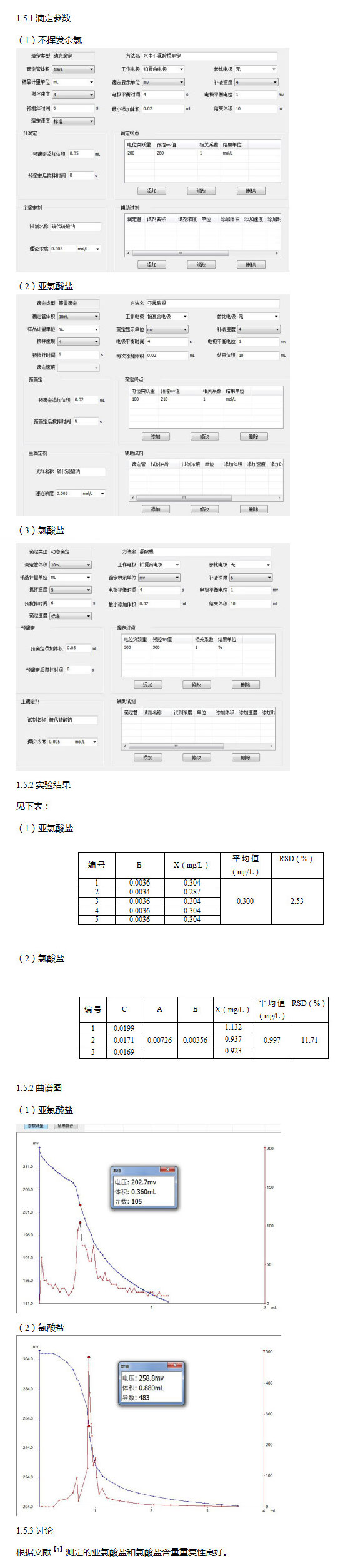 (1)取100mL试样溶液置于滴定杯中,加入1g碘化钾。密封滴定杯等待1min。用硫代硫酸钠溶液(0.005 mol/L)测定水样中的不挥发余氯。