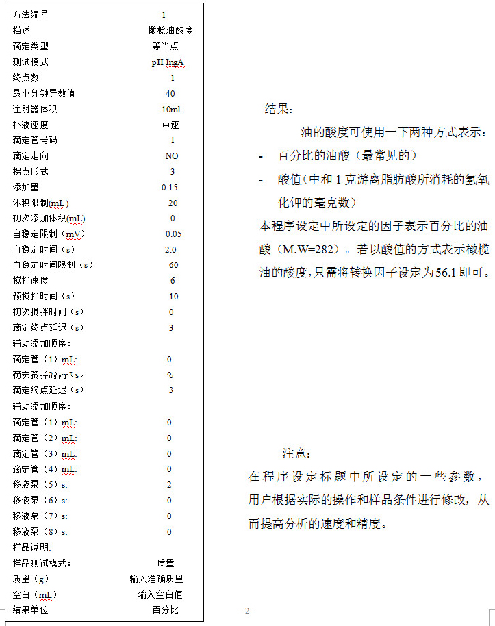 - 在手动方法中,使用KOH的乙醇溶液滴定溶剂混合物中添加直至指示剂即酚酞颜色发生变化,这是非常重要的。同样的使用滴定仪时如果不以这种方式进行滴定操作,是不准确的。
