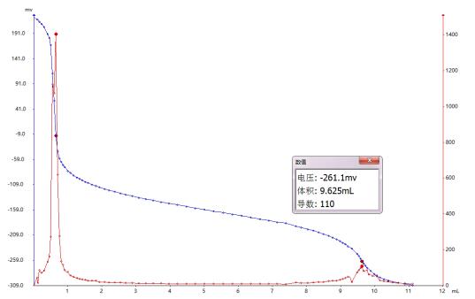 金刚烷胺样品在105℃下烘干5h,后准确称取约0.15g样品于滴定杯中,用移液管准确吸取5mL盐酸溶液(0.01mol/L)使样品溶解,加入50mL无水乙醇,搅拌均匀后用氢氧化钠滴定液滴定,两个突跃点的体积之差为滴定体积。