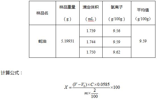根据文献要求,用电位滴定法测定蚝油中氯离子含量,同一样品平行试验的测定差小于0.1g/100g,实验结果重复性较好。