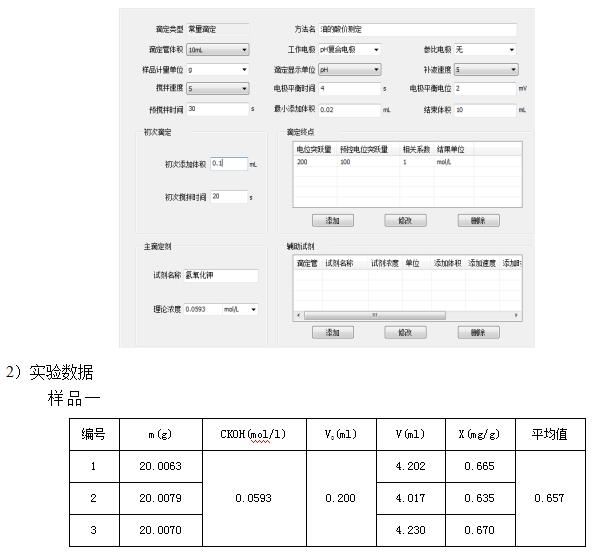 测定方法:准确称取20g左右的油脂(若为固体先将其融化),置于滴定杯中,加入异丙醇-乙醚混合溶液60ml溶解,搅拌均匀,用氢氧化钾标准滴定液(0.1mol/l),以pH非水电极为工作电极,在T960上进行滴定至终点。