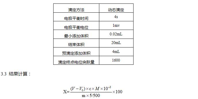 于称量瓶中快速称取约5g预先于105℃±2℃干燥至恒重的试样,精确至0.0001g,加水溶解后,移入500mL容量瓶中,用水稀释至刻度,摇匀。用移液管移取5mL上述溶液于滴定杯中,加入80mL水,8mL硫酸溶液(1+1),插入铂电极和甘汞电极,并搅拌均匀,用硫酸亚铁铵标准滴定溶液(0.2mol/L)滴定至终点,同时作空白试验。