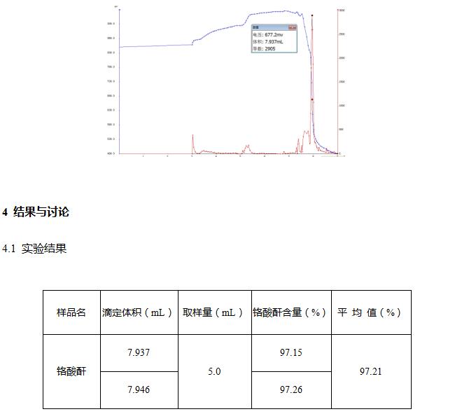 用电位滴定法测定铬酸酐的含量,操作步骤简单、结果准确,节省了时间和人力。