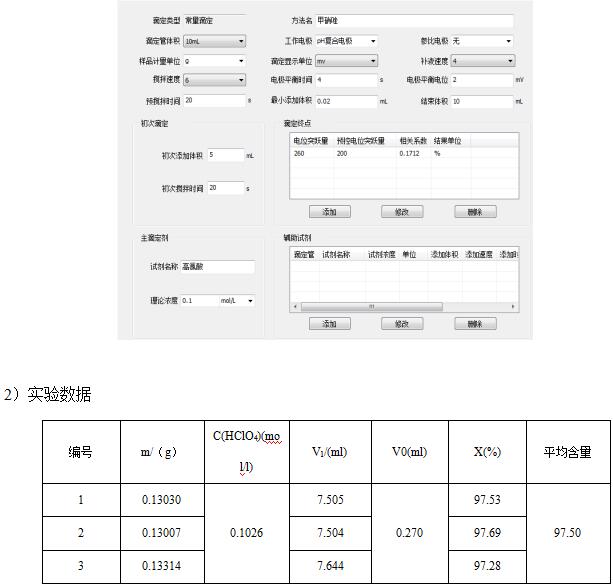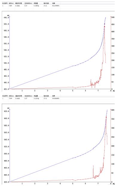 样品中甲硝唑含量为97.50%(此结果按湿品计算)。样品中的水分会对重复性有影响,建议用干品进行试验。从图谱中可看出,突跃大滴定终点一目了然。配合滴定仪自动进样器进行滴定,操作方便节省了时间和人力,能快速的检测出结果。