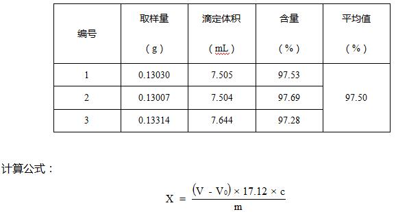 样品中甲硝唑含量为97.50%(此结果按湿品计算)。样品中的水分会对重复性有影响,建议用干品进行试验。配合滴定仪自动进样器进行滴定,操作方便节省了时间和人力,能快速的检测出结果。