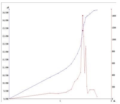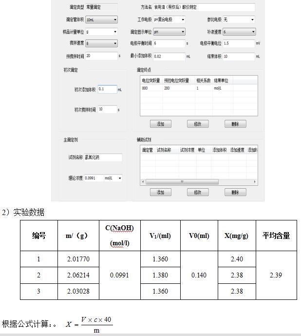 测定方法:准确称取2g左右样品,置于滴定杯中,加入异丙醇-乙醚混合溶液60ml溶解,搅拌均匀,用氢氧化钠标准滴定液(0.1mol/l),以pH非水电极为工作电极,在T960上进行滴定至终点。