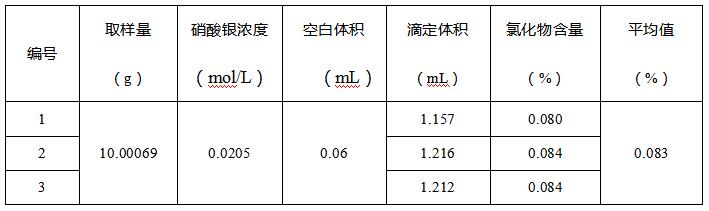 称取混合均匀的试样10g(精确至1mg)于100mL具塞比色管,加入50mL约70℃热水,震荡分散样品,水浴中沸腾15min,并不时摇动,取出,超声处理20min,冷却至室温,依次加入2mL沉淀剂Ⅰ和2mL沉淀剂Ⅱ,每次加后摇匀。用水稀释至刻度,摇匀,在室温静置30min。用滤纸过滤,弃去最初滤液,取部分滤液测定。移取10.00mL试液,于50mL烧杯中,加入5mL硝酸溶液和25mL丙酮。用硝酸银滴定液滴定至终点,同时做空白实验。