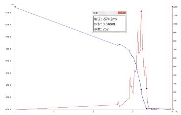 吸取碱性酒石酸铜甲液5.0mL和碱性酒石酸铜乙液5.0mL于滴定杯中,加水10mL,再加入2mL试样稀释液,将电陶炉设为内环火500℃,控制在2min内加热至沸,选择“动态滴定”模式,保持微沸滴定至终点,记录样液消耗滴定液的体积。