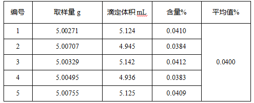 国标要求重复性限为0.005%,本次实验结果最大差值是0.0029%,符合文献对于重复性限的要求。实验证明T860电位滴定仪满足水泥国标中对于氯离子含量的测定要求。