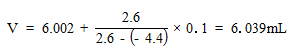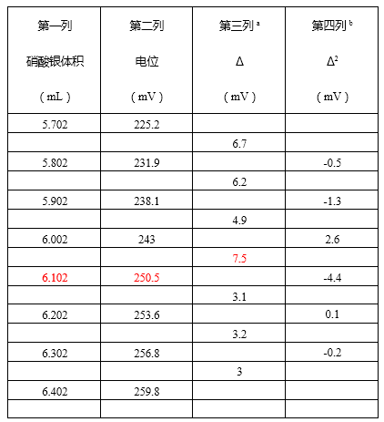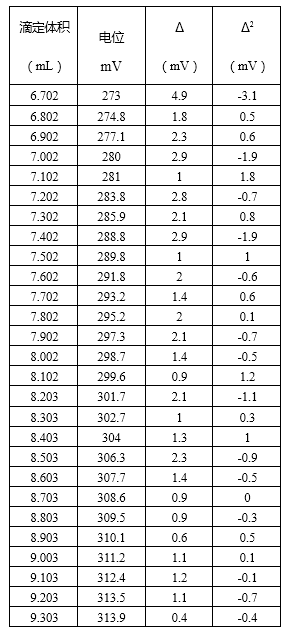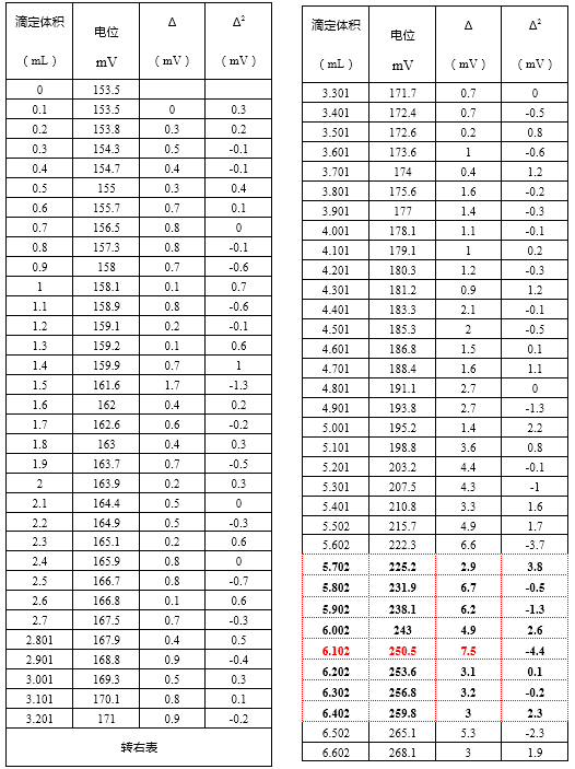 计量点在最大的Δ/mV(第三列),即在6.002mL和6.102mL之间。由Δ2/mV(第四列)按下式计算在0.10间隔的准确计量点: