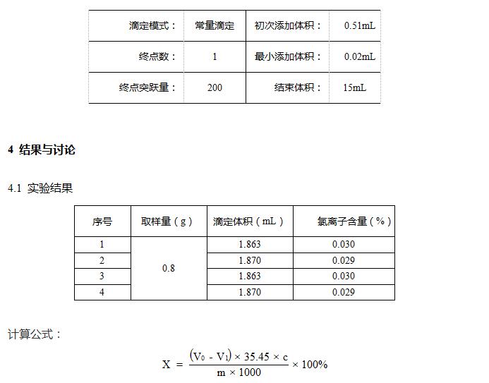 样品中氯离子含量很低,直接滴定不易滴定,测试平行性较好。
