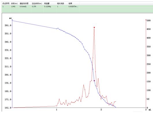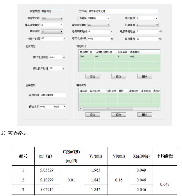 测定方法:准确称取5g左右样品,置于滴定杯中,加入冰醋酸-异辛烷混合溶液50ml溶解,搅拌均匀,向滴定杯中准确加入0.5ml饱和碘化钾溶液,开动搅拌器,在合适的搅拌速度下反应60s,立即向滴定杯中加入40ml去离子水,插入电极和滴定头,设置好参数,用硫代硫酸钠标准滴定液(0.01mol/l),以铂复合电极为工作电极,在T960上进行滴定至终点。