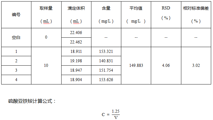 待消解罐冷却后,将消解后的溶液转入滴定杯中,用30mL一级水清洗消解罐壁,并将清洗液一并转入滴定杯中。冷却后用标定好的硫酸亚铁铵滴定至终点。空白样品用10mL一级水代替。