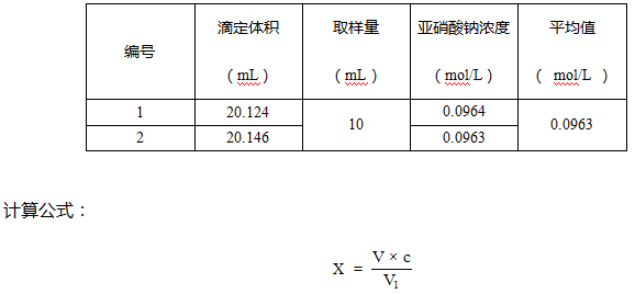 V1 --样品试验消耗亚硝酸钠标准滴定溶液体积,单位为毫升(mL);