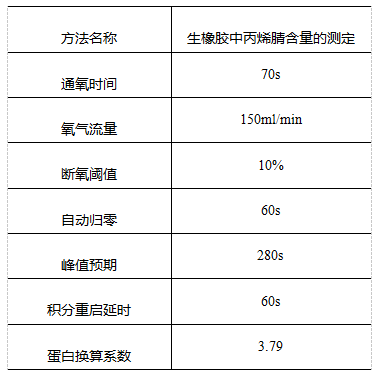实验采用杜马斯燃烧法使丁腈橡胶在高纯氧气中燃烧释放出氮,参照《ISO 24698-1 丁腈橡胶中丙烯腈含量的测定 第一部分 燃烧分析法》方法,使用杜马斯分析仪定量测定。