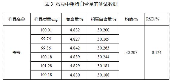 另外使用D100杜马斯定氮仪测试蚕豆中的粗蛋白含量,重复性符合两个独立测量结果之间的绝对差值不超过算术平均值的10%的要求,且RSD均小于0.5%,重复性良好。