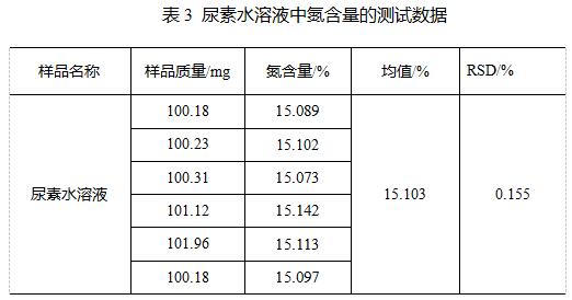 另外使用D100杜马斯定氮仪测试尿素水溶液中的氮含量,重复性符合《GB 29518-2013 柴油发动机氮氧化物还原剂 尿素水溶液(AUS32)》中规定的r值小于0.4的要求,且RSD值小于0.5%,重复性良好。