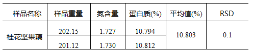 测试结果显示桂花坚果藕粉中的蛋白质含量平均值为10.80%,符合其标示的10.8%的蛋白质含量,为合格产品。另外使用D50杜马斯定氮仪测试桂花坚果藕粉中的蛋白质含量精密度符合《GB 5009.5-2016食品安全国家标准 食品中蛋白质含量检测》中规定的在重复条件下获得的两次独立测试结果的绝对差值不超过算术平均值的10%。