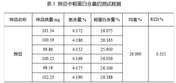 另外使用D100杜马斯定氮仪测试豌豆中的粗蛋白含量,重复性符合两个独立测量结果之间的绝对差值不超过算术平均值的10%的要求,且RSD均小于0.5%,重复性良好。