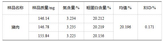 另外使用D100杜马斯定氮仪测试猪肉中的粗蛋白含量精密度符合《GB 5009.5-2016 食品安全国家标准 食品中蛋白质的测定》中规定的两次独立测定结果的绝对差值不超过算术平均值的10%的要求,且RSD值为0.171%,重复性良好。