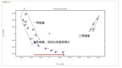 在聚类分析中,一等蜂蜜和三等蜂蜜各自聚集在一起,分居PCA的两端,随着向一等蜂蜜中加入三等蜜含量的增加,混合蜜逐渐向三等蜜靠近。若建立真实蜂蜜样品的挥发性有机物数据模型后,可快速判断未知来源的蜂蜜样品是否掺伪及其掺伪的含量。