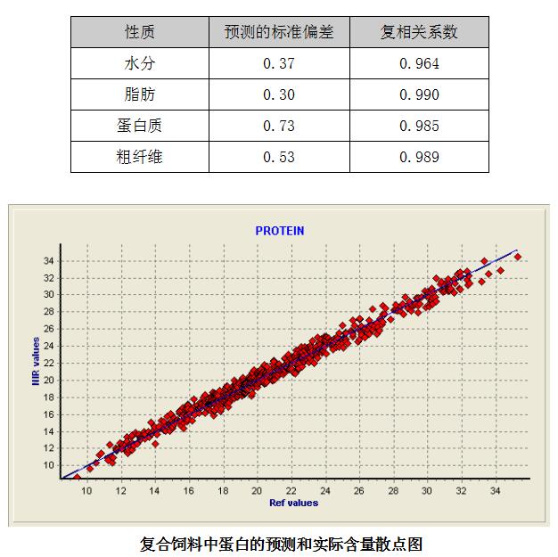 建立复合饲料水分、蛋白质、脂肪和粗纤维的偏最小二乘(PLS)模型。相关系数表示的是湿化学测试和近红外测试结果的一致性。系数接近1几乎完全相关,这与实验室的精密程度和成分范围有关。预测的标准偏差反映了此定标模型对不参与制作建模的样品集的预测性能。下表显示的是模型外部预测的相关系数和标准偏差。