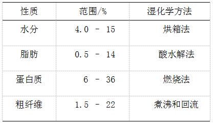用约300份复合饲料建立了水分、蛋白质、脂肪和粗纤维标准。下表显示的是校正集样品的水分、蛋白质、脂肪和粗纤维范围,以及分析用的湿化学方法。