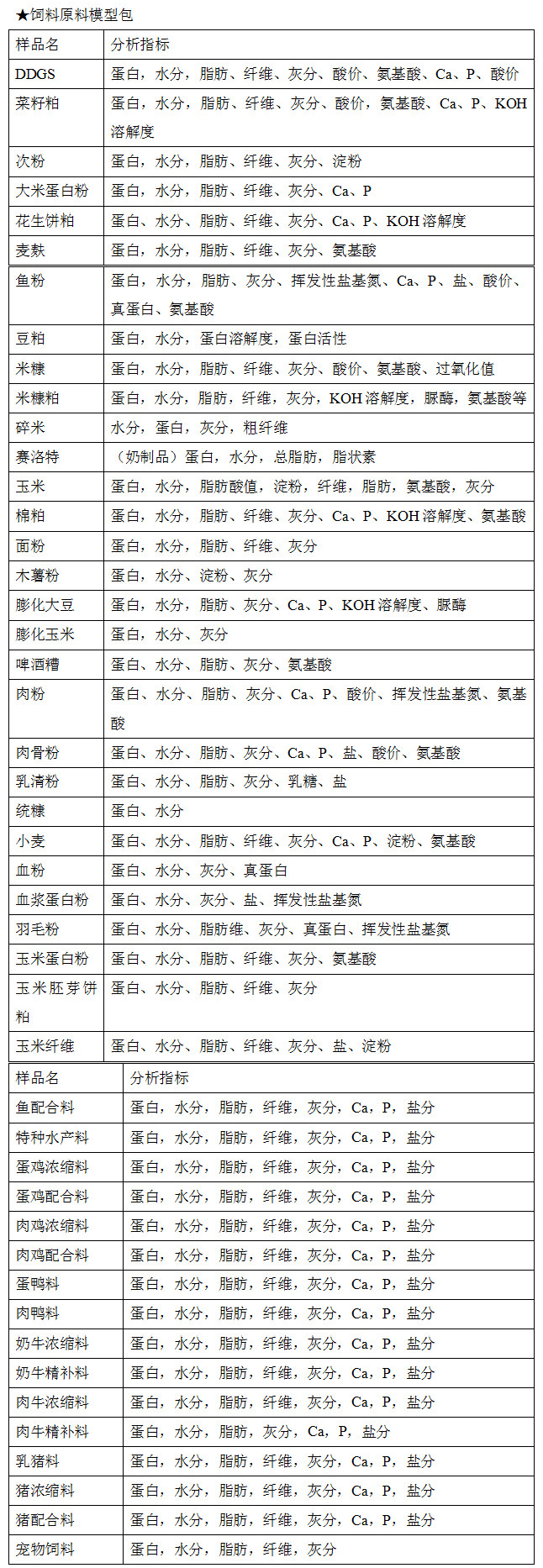 1. 根据检测需求,为您制定两个检测模型包,包含饲料原料模型包和成品饲料模型包,初步建立统计模型如下列表。