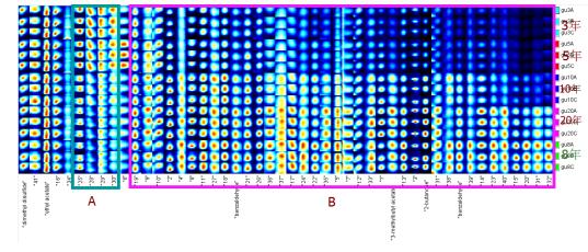 3. RIP峰右侧的每一个点代表一种挥发性有机物如区域A,白色表示该挥发性有机物浓度较少,红色表示该挥发性有机物浓度较大,颜色越深表示浓度越大(如区域B中标出的几种挥发性有机物)。