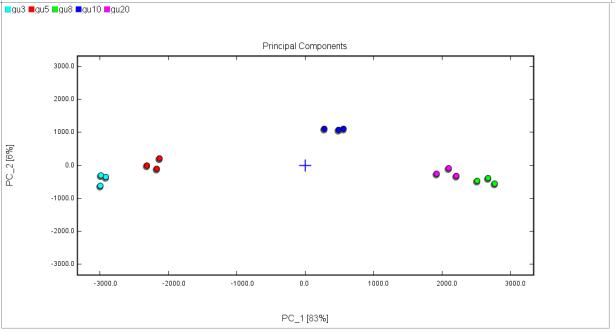 软件根据所选择挥发性有机物信号峰对其进行主成分分析,据此对样品进行统计学上的分类,比较区别与差异,如下图所示。