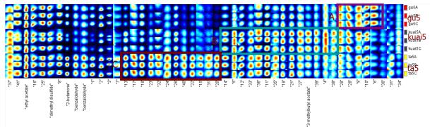 1.以gu5A为参比,对比ta5A至kuai5A与之的差异,浓度相同的物质颜色抵消为白色,如ta5A的背景颜色,参比样品的背景颜色仍为蓝色。