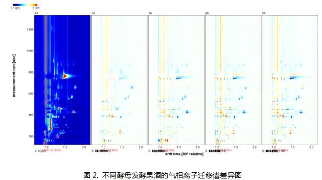 为了更加明显比较不同样品的差异,选取其中一个样品的谱图1A为参比,其他样品的谱图扣减参比。如果二者挥发性有机物一致,则扣减后的背景为白色,而红色代表该物质的浓度高于参比,蓝色代表该物质的浓度低于参比。下图可以看出不同酵母对果酒风味影响的差异变化。