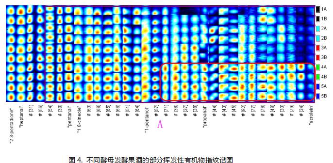 1) 区域A标出的挥发性有机物如acrolein(丙烯醛)、propanal(丙醛)、1-pentanol(丙醇)、1,8-cineole(1,8-桉树脑)、pentanal(戊醛)等物质随着5种酵母的不同,发酵后果酒中这类挥发性有机物的含量逐渐增加,其中红框圈出的物质在1号、2号和3号酵母中的含量较低,而在4号和5号酵母发酵的果酒中含量最高。