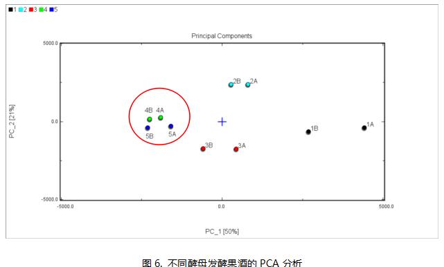 3) 由上图分析可知,4号和5号酵母发酵的果酒风味最为相似,与前三种酵母发酵的果酒风味差异较大。
