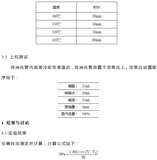 硫酸(分析纯),硼酸(分析纯),氧化钠(分析纯),溴甲酚绿-甲基红混合指示剂,催化剂片(3g硫酸钾和0.2g硫酸铜混合均匀压片),0.1mol/L盐酸标准滴定液。