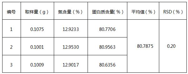 通过数据可知,利用全自动凯氏定氮法测定初乳碱性蛋白粉中的蛋白质含量平行性良好,且具有操作简单,安全性高,节省人力等优点。