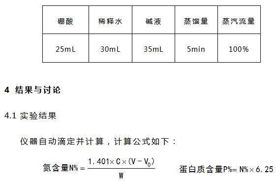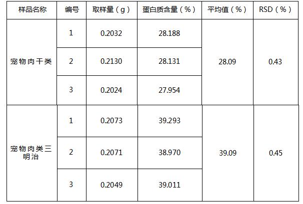 通过以上测得数据可知,利用全自动凯氏定氮仪测定宠物肉干类零食、宠物肉类三明治零食中的蛋白质含量平行性良好,具有操作简单,安全性高,节省人力等优点。