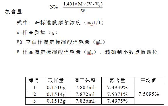酵母粉中的有机态氮在浓硫酸和催化剂的共同作用下,转化为氨态氮。加碱蒸馏后,用硼酸吸收后,再以盐酸或硫酸标准滴定液进行滴定。
