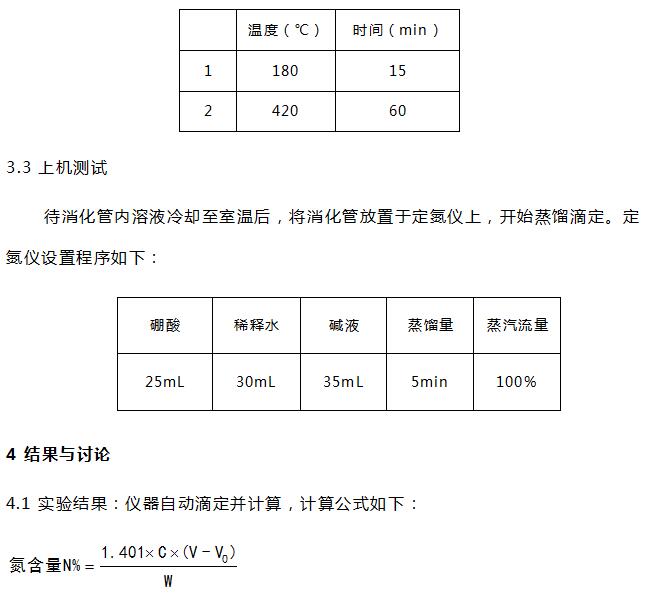 硫酸(分析纯)、硼酸(分析纯)、氢氧化钠(分析纯)、溴甲酚绿-甲基红混合指示剂、催化剂片(3g硫酸钾和0.2g硫酸铜混合均匀压片)、0.1mol/L硫酸标准滴定液等。