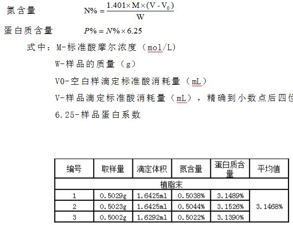 植脂末中的有机态氮在浓硫酸和催化剂的共同作用下,转化为氨态氮。加碱蒸馏后,用硼酸吸收后,再以盐酸或硫酸标准滴定液进行滴定。